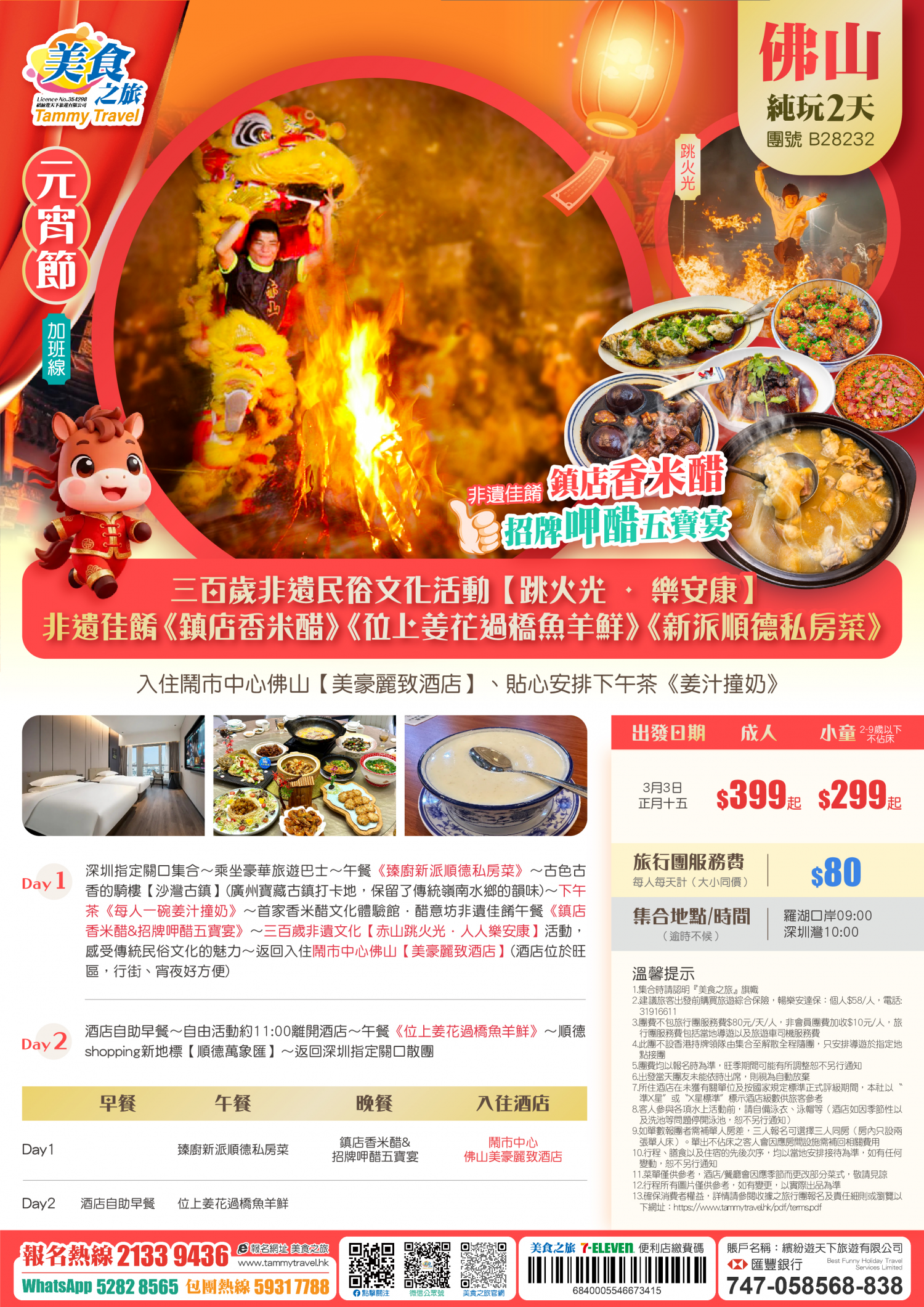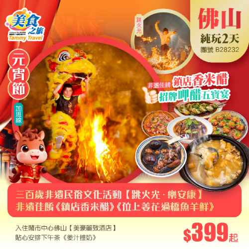【26年元宵】三百歲非遺民俗文化活動·里水【跳火光·樂安康】、非遺佳餚《鎮店香米醋&招牌呷醋五寶宴》《位上姜花過橋魚羊鮮》、入住鬧市中心佛山【美豪麗致酒店】、貼心安排《姜汁撞奶下午茶》純玩2天