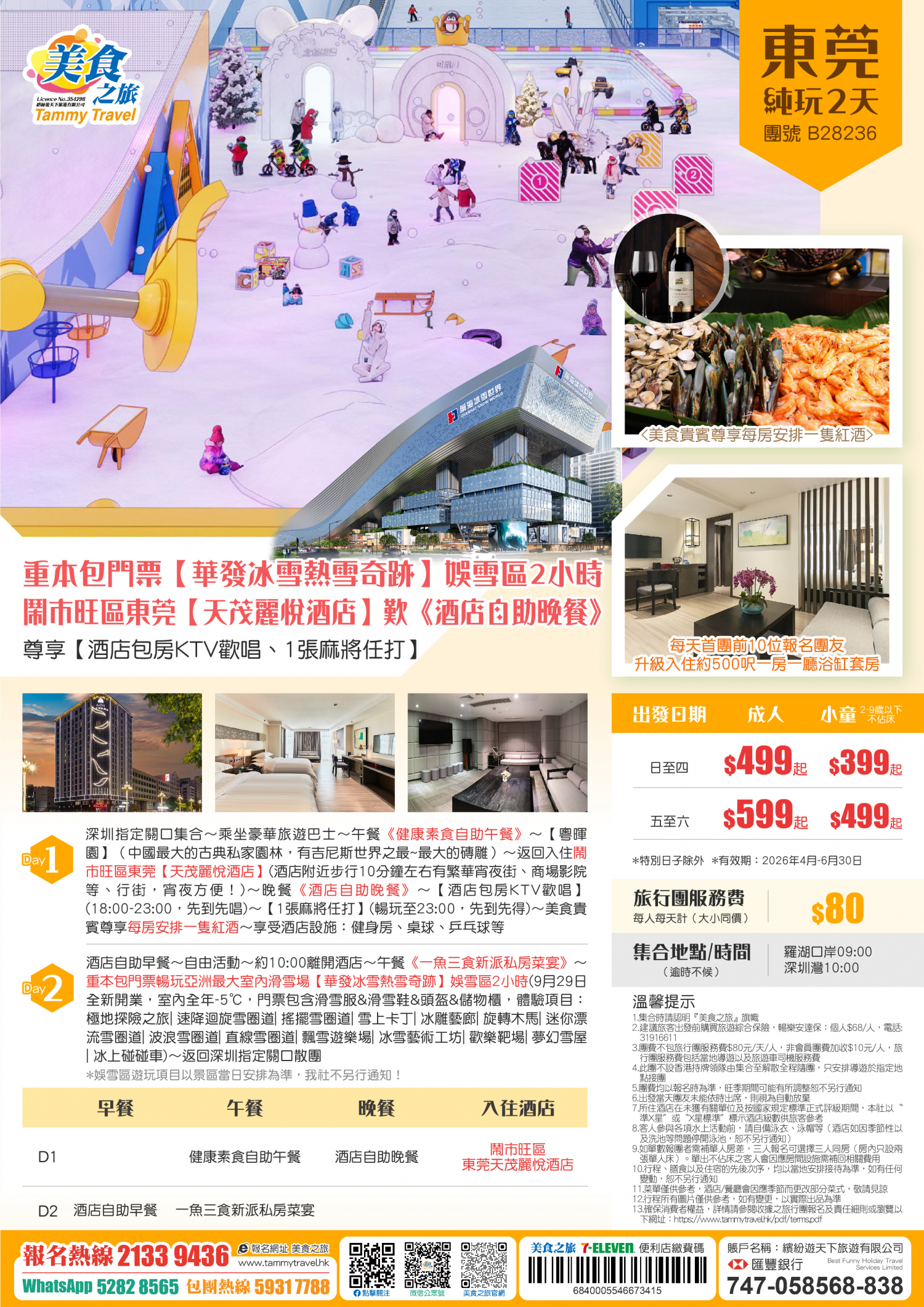重本包門票暢玩【華發冰雪熱雪奇跡】娛雪區2小時、鬧市旺區東莞【天茂麗悅酒店】歎《酒店自助晚餐》、尊享酒店包房KTV歡唱、麻將任打純玩2天