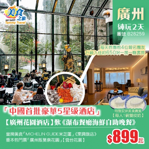 【星級享受】中國首批豪華5星酒店之一【廣州花園酒店】歎《酒店瀑布餐廳海鮮自助晚餐》、皇牌美食「MICHELIN GUIDE米芝蓮」《東興飯店》+順德老牌飯店《滋粥樓私房菜宴》純玩2天
