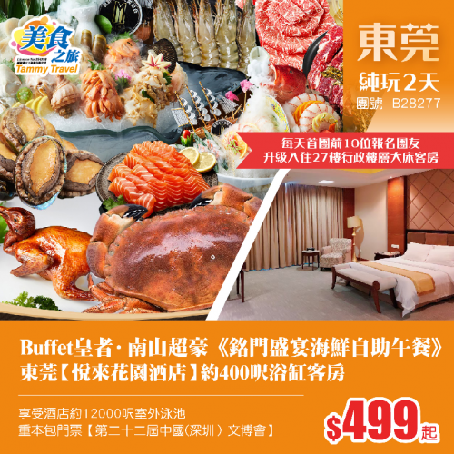 Buffet皇者·南山超豪《銘門盛宴海鮮自助午餐》、東莞【悅來花園酒店】約400呎浴缸客房、享受約12000呎室外泳池、重本包門票【第二十二屆中國(深圳)文博會】純玩2天