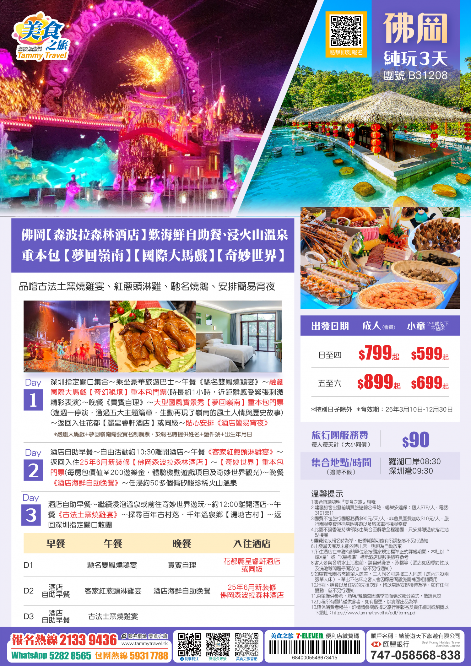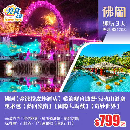 重本包門票【夢回嶺南】【國際大馬戲】【奇妙世界】、入住佛岡【森波拉森林酒店】歎酒店海鮮自助餐、浸火山溫泉、品嚐《古法土窯燒雞+紅蔥頭淋雞》《馳名燒鵝》純玩3天
