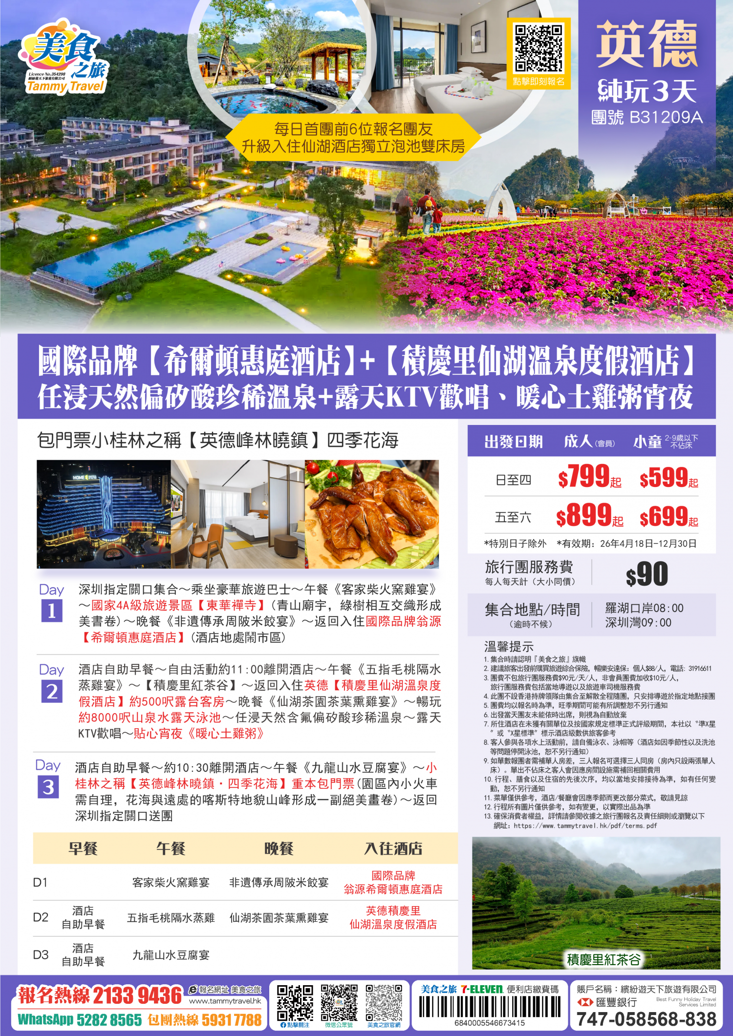 國際品牌翁源【希爾頓惠庭酒店】+英德【積慶里仙湖溫泉度假酒店】約8000呎山泉水泳池、任浸天然偏矽酸珍稀溫泉+露天KTV歡唱、暖心土雞粥宵夜+重本包【英德峰林曉鎮】純玩3天