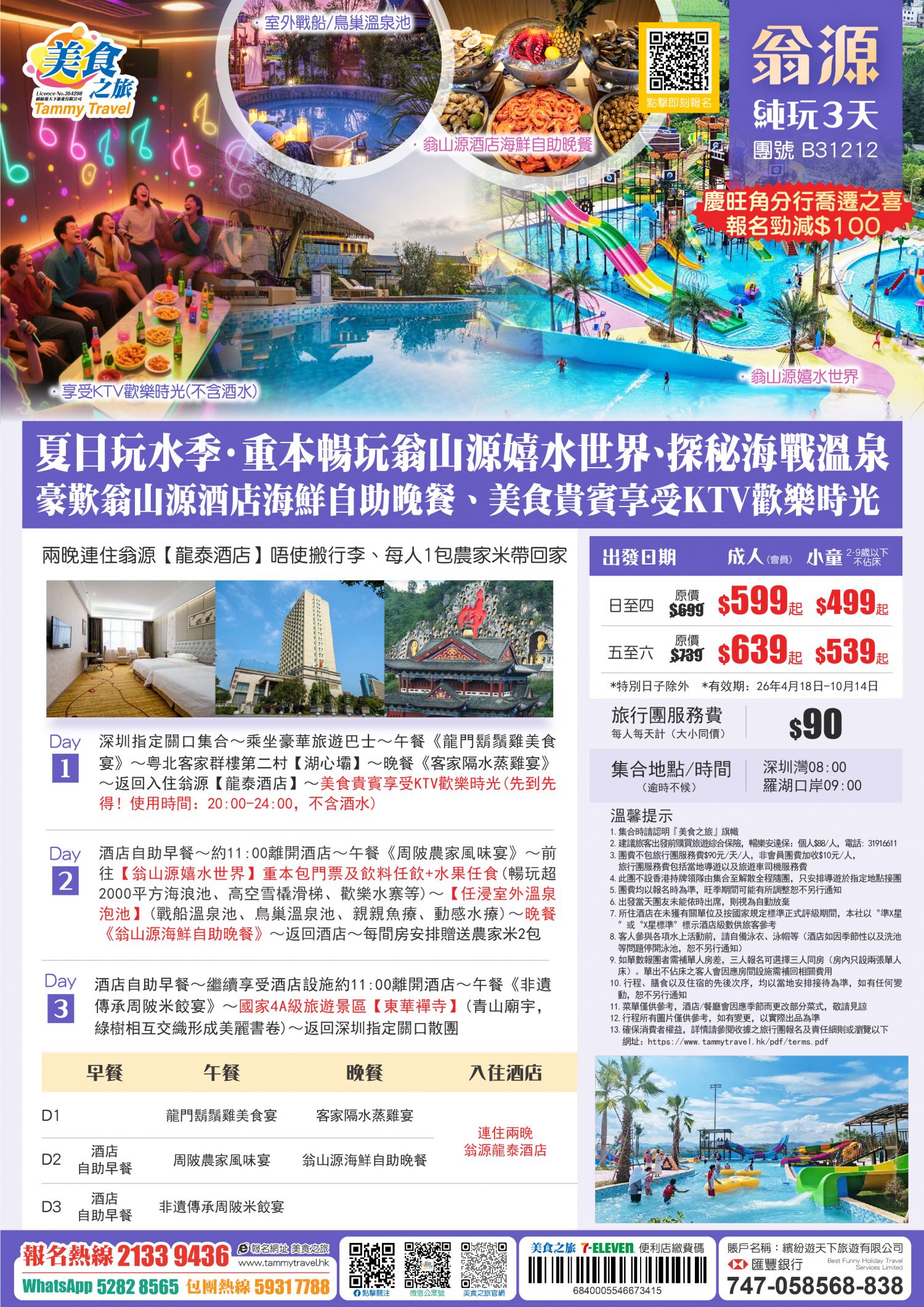 【慶旺角喬遷·勁減$100】夏日玩水·重本暢玩翁山源嬉水世界+探秘海戰溫泉+豪歎翁山源酒店海鮮自助晚餐、兩晚連住翁源【龍泰酒店】唔使搬行李+貴賓享受KTV歡樂時光 純玩3天