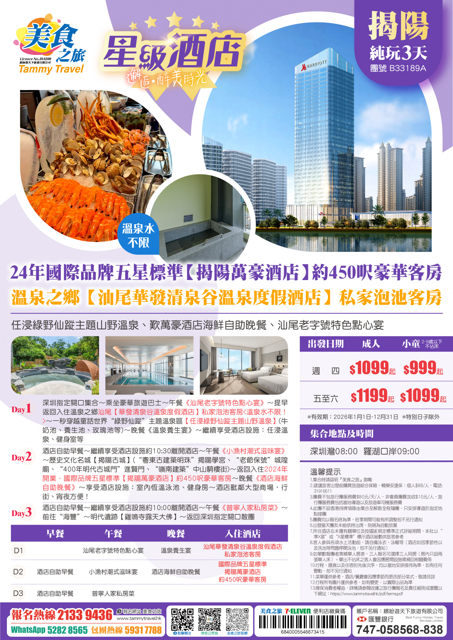 24年國際品牌五星標準【揭陽萬豪酒店】約450呎豪華客房+溫泉之鄉【汕尾華發清泉谷溫泉度假酒店】私家泡池客房、任浸綠野仙蹤主題山野溫泉、歎萬豪酒店海鮮自助晚餐、汕尾老字號特色點心宴 純玩3天
