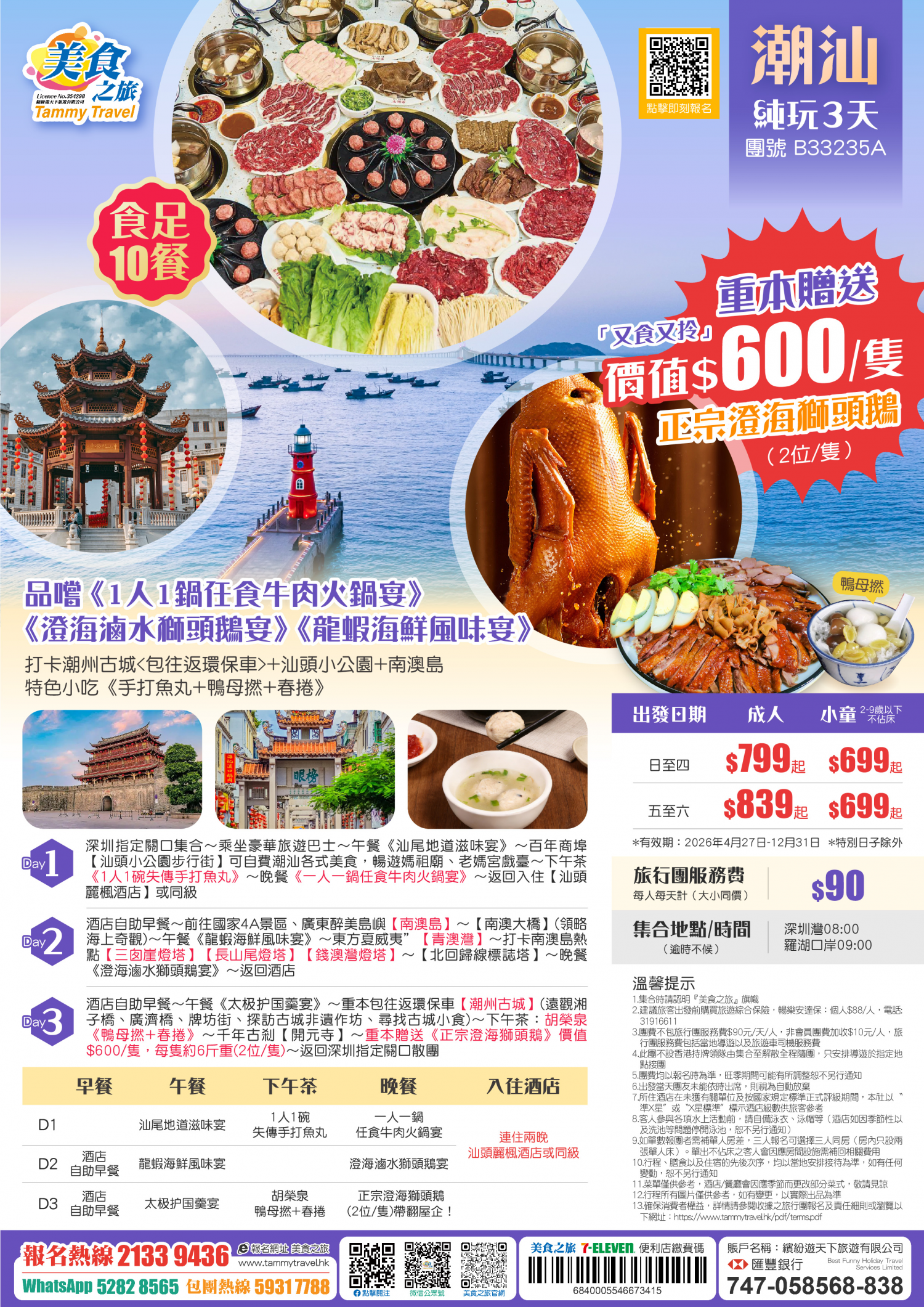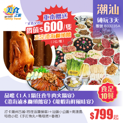 「又食又拎」重本贈送正宗澄海獅頭鵝、品嚐1人1鍋任食牛肉火鍋+澄海滷水獅頭鵝+龍蝦海鮮風味、特色小吃《手打魚丸+鴨母撚+春捲》、打卡潮州古城+汕頭小公園+南澳島 純玩3天
