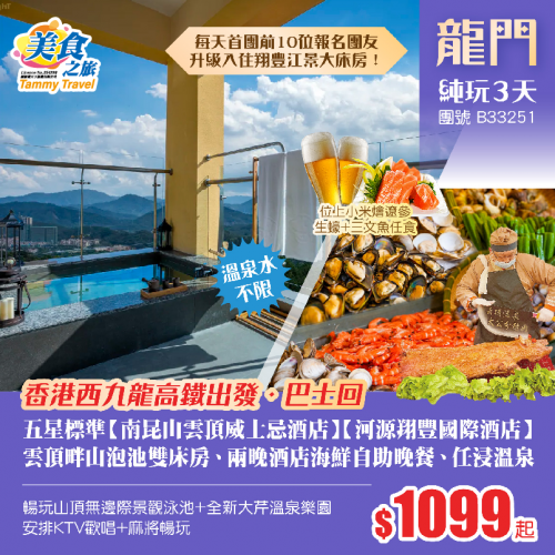 「香港西九龍高鐵出發·巴士回」兩晚星級酒店【河源翔豐國際酒店】【南昆山雲頂威士忌酒店】、雲頂畔山泡池房、歎兩晚酒店自助餐、暢玩山頂無邊際泳池+大芹溫泉樂園+任浸溫泉、KTV歡唱+麻將暢玩 純玩3天