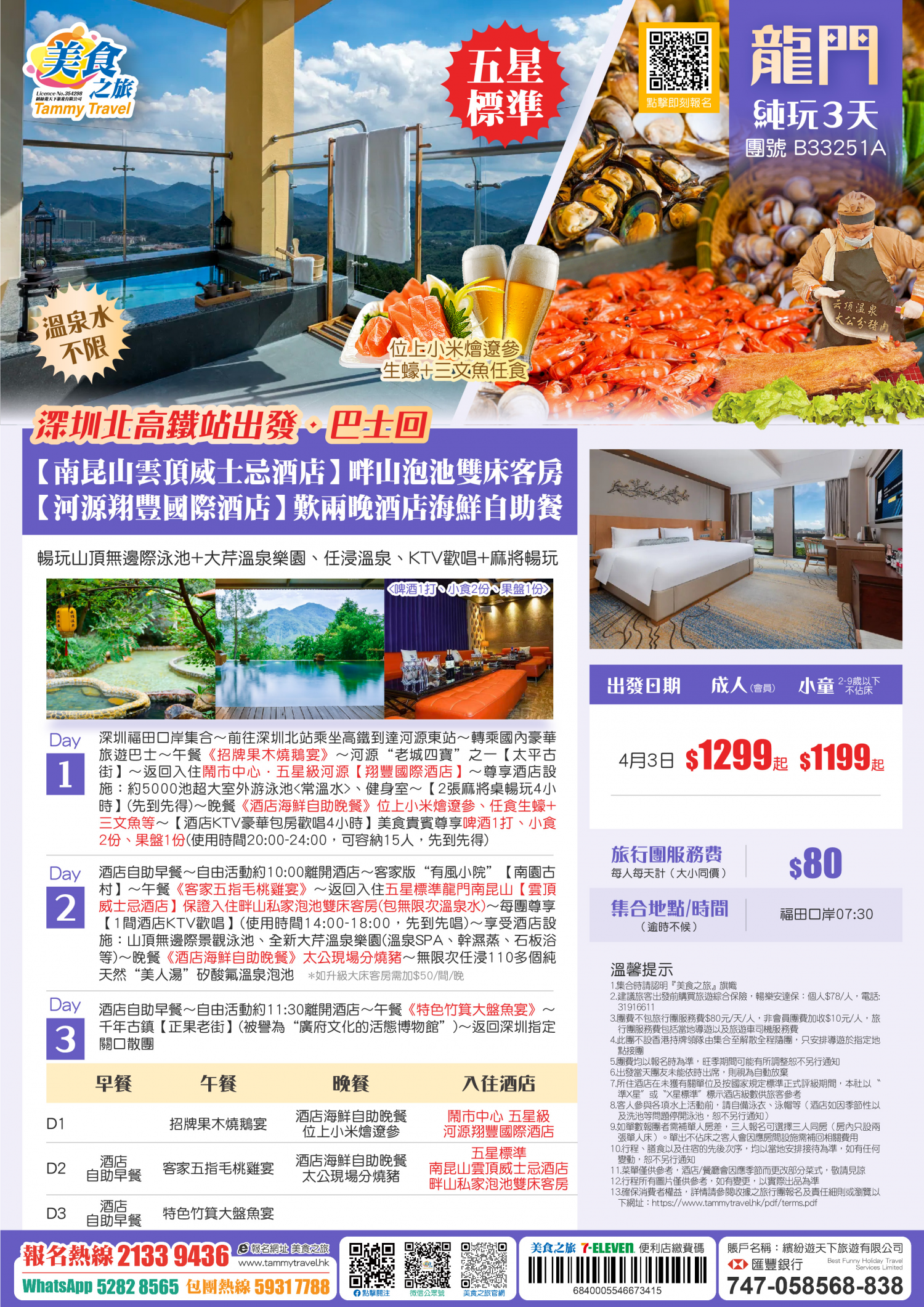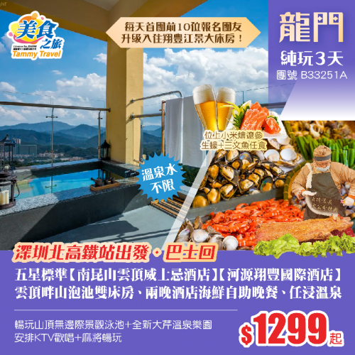 「深圳北高鐵站出發·巴士回」兩晚星級酒店【河源翔豐國際酒店】【南昆山雲頂威士忌酒店】、雲頂畔山泡池房、歎兩晚酒店自助餐、暢玩山頂無邊際泳池+大芹溫泉樂園+任浸溫泉、KTV歡唱+麻將暢玩 純玩3天