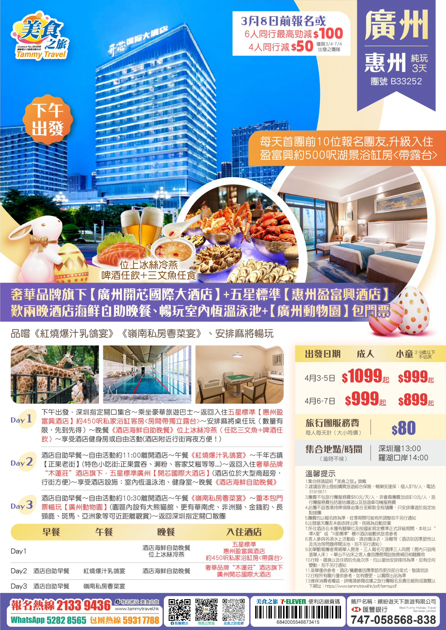 【26年復活節·下午出發】奢華品牌旗下【廣州開芯國際大酒店】+五星標準【惠州盈富興酒店】、歎兩晚酒店海鮮自助晚餐、暢玩室內泳池+【廣州動物園】包門票、品嚐《紅燒爆汁乳鴿宴》《嶺南私房粵菜宴》 純玩3天