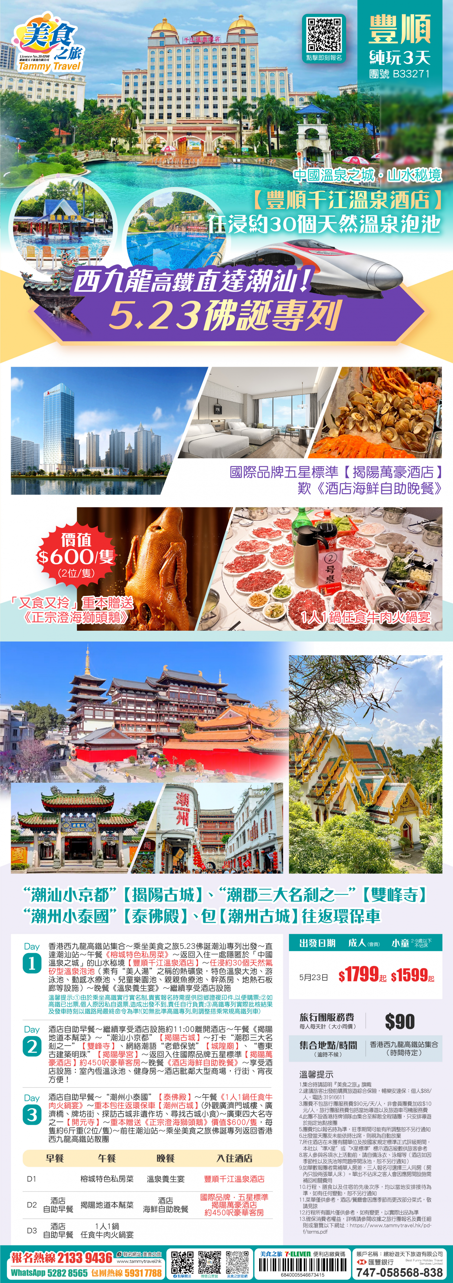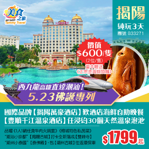 「西九直達潮汕-5.23佛誕專列」重本贈送正宗澄海獅頭鵝、國際品牌【揭陽萬豪酒店】歎海鮮自助晚餐+【豐順千江溫泉酒店】任浸天然溫泉、品嚐《1人1鍋任食牛肉火鍋》、打卡雙峰寺+泰佛殿 純玩3天