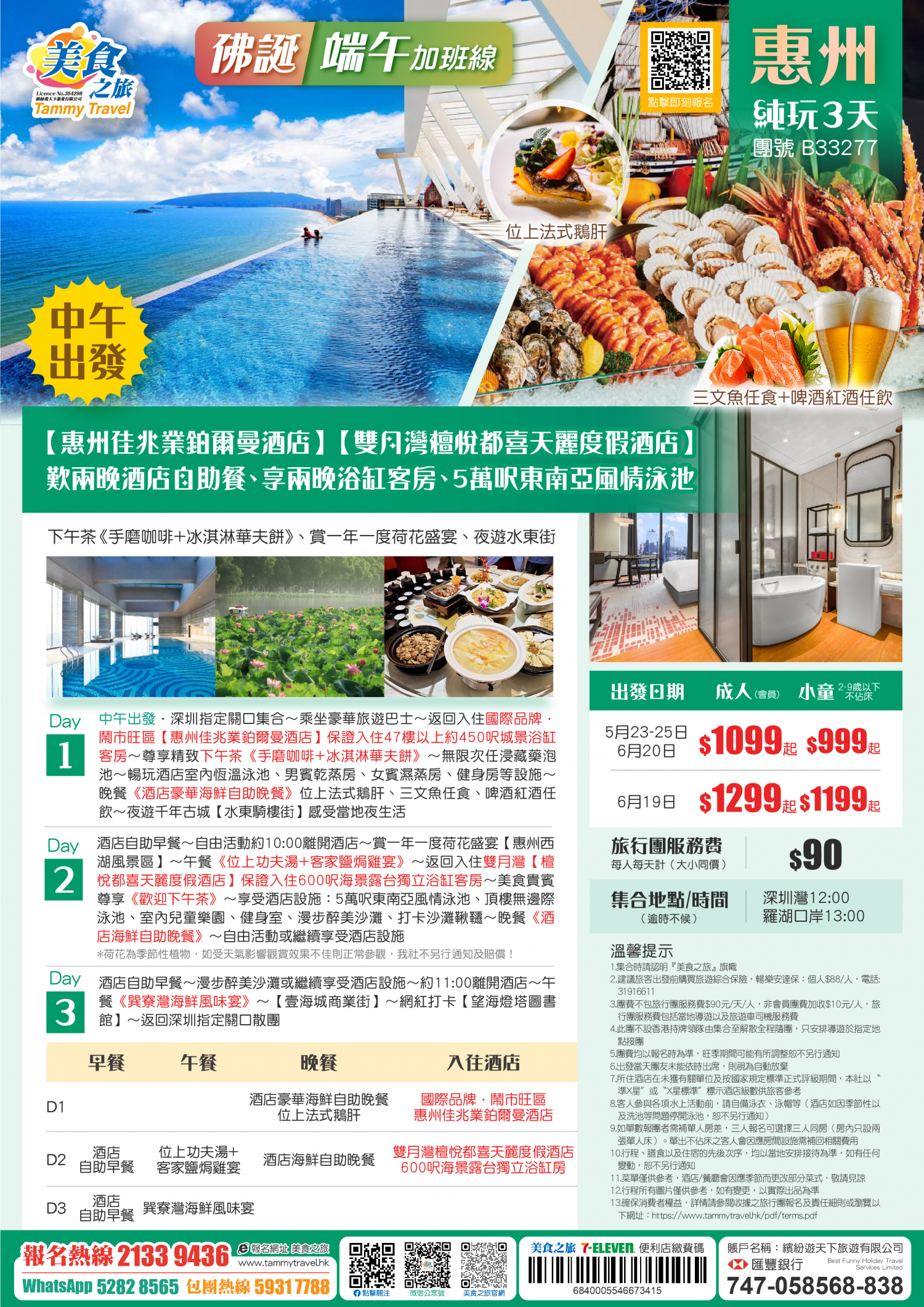 【26年佛誕節+端午節】中午出發!國際品牌【惠州佳兆業鉑爾曼酒店】+【雙月灣檀悅都喜天麗度假酒店】、歎兩晚酒店海鮮自助晚餐、尊享兩晚浴缸客房、暢玩5萬呎東南亞風情泳池、賞一年一度荷花盛宴 純玩3天
