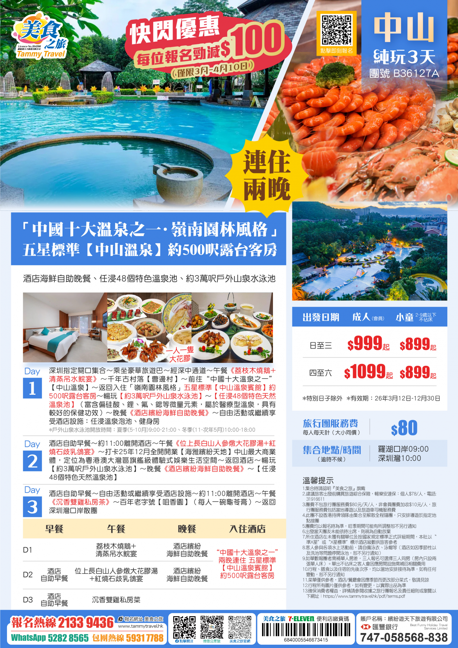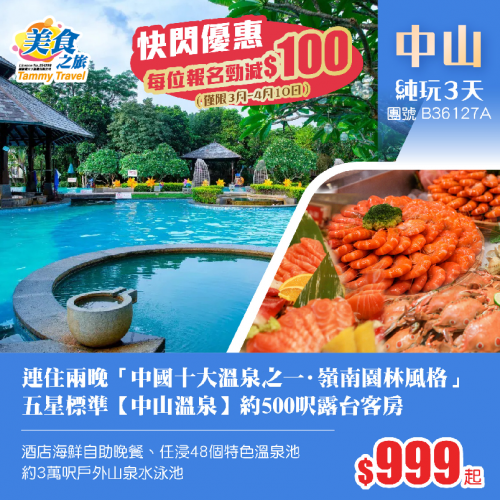 【2晚連住】「中國十大溫泉之一·嶺南園林風格」五星標準【中山溫泉】約500呎露台客房、歎兩晚酒店海鮮自助晚餐、任浸48個特色溫泉池、暢玩約3萬呎戶外山泉水泳池 純玩3天