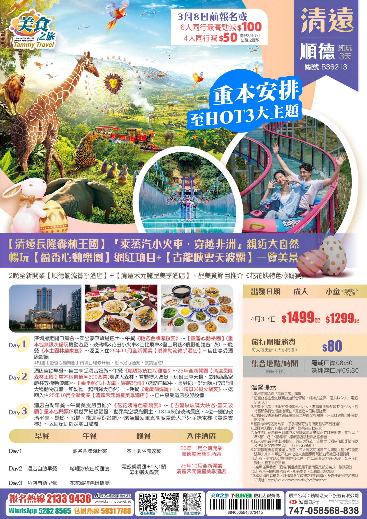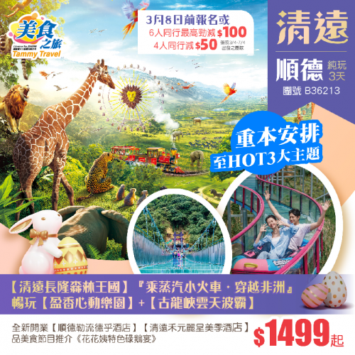 【26年復活節】重本安排激情暢玩至HOT 3大主題、 【清遠長隆森林王國】乘蒸汽小火車●穿越非洲、 暢玩【盈香心動樂園】+【古龍峽雲天波霸】、 2晚全新開業【順德勒流德乎酒店】+【清遠禾元麗呈美季酒店