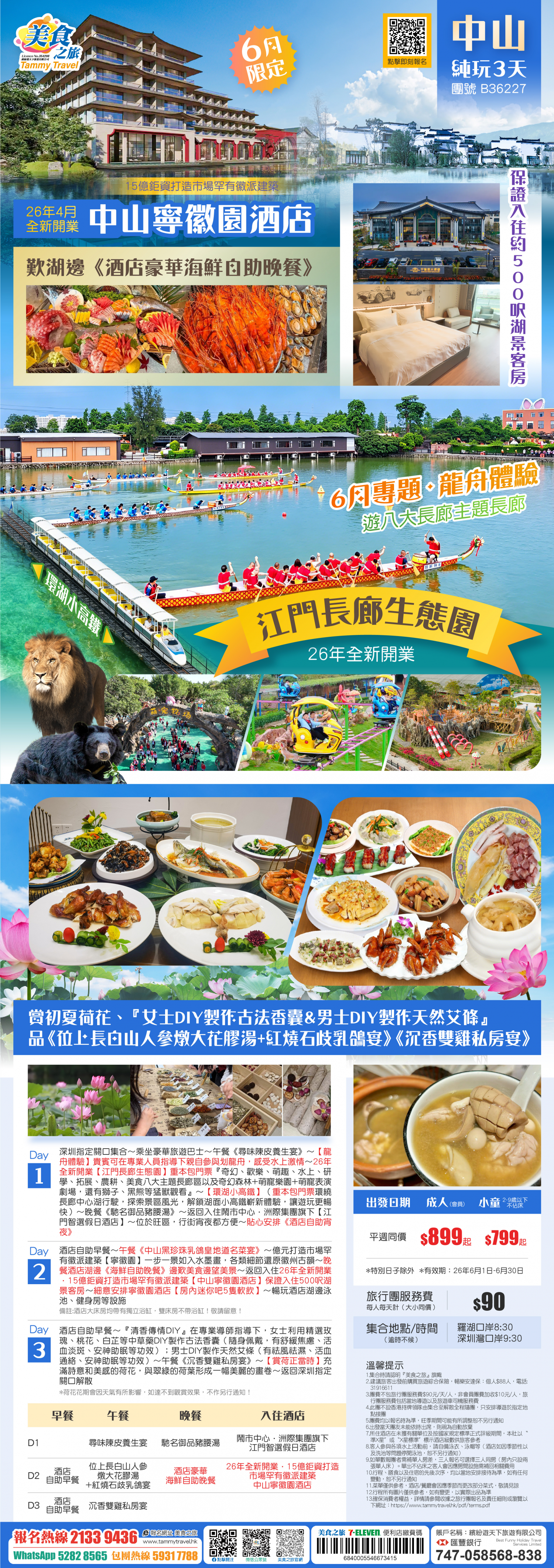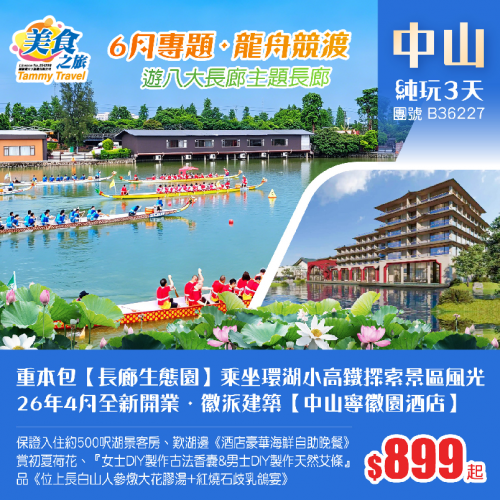 『6月專題龍舟體驗』重本包【長廊生態園】遊八大主題長廊、『環湖小高鐵』、26年全新開業·15億鉅資打造市場罕有徽派建築【中山寧徽園酒店】湖景客房、歎《自助晚餐》、清香傳情DIY、賞荷、品美食 純玩3天