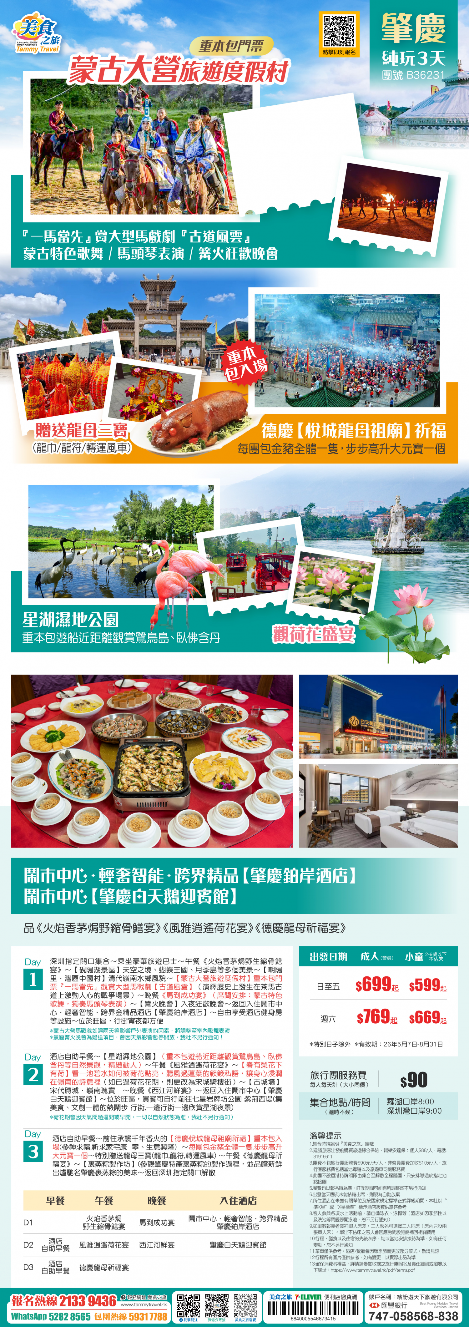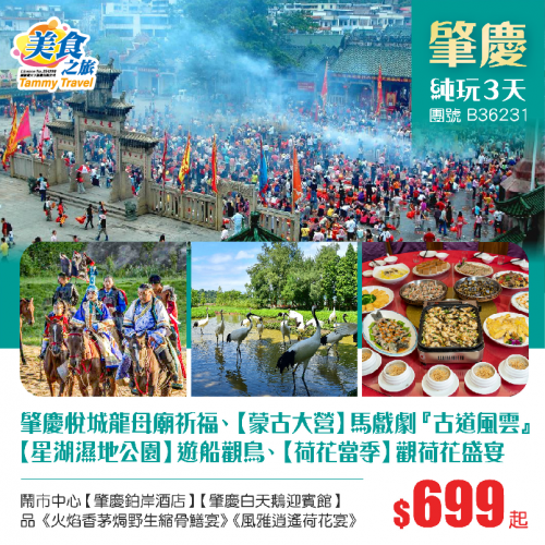 重本包【龍母廟祈福】【鴻運金豬】【龍母三寶】 、【蒙古大營】馬戲劇『古道風雲』、特色歌舞、馬頭琴表演 【星湖遊船觀鳥】、賞荷花、 2晚鬧市中心【肇慶鉑岸酒店】【肇慶白天鵝迎賓館】 純玩3天