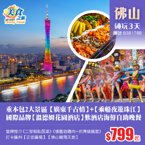 重本包2大景區【廣東千古情】+【乘船夜遊珠江】、連住兩晚國際品牌【溫德姆花園酒店】歎1晚酒店海鮮自助晚餐+皇牌推介《百年祠堂二世祖私房菜》純玩3天
