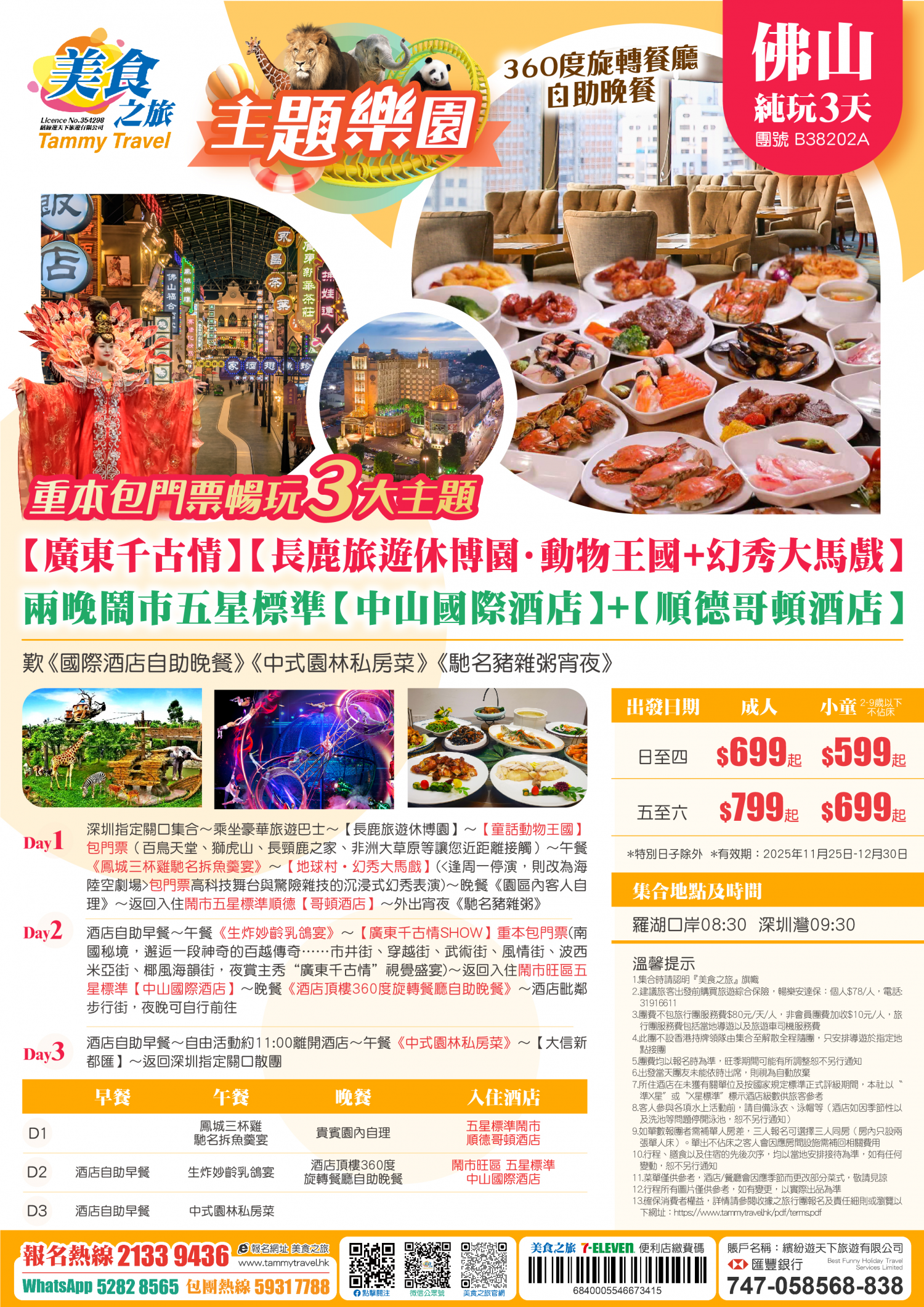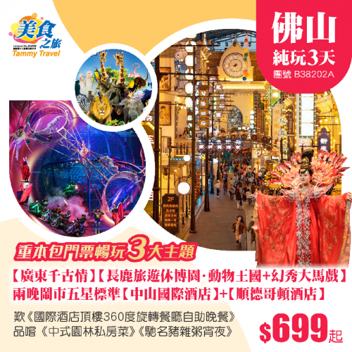 暢玩3大主题·視覺盛宴【廣東千古情】【長鹿旅遊休博園·動物王國+幻秀大馬戲】、兩晚鬧市五星標準【中山國際酒店】+【順德哥頓酒店】、歎《國際酒店自助晚餐》、品《中式園林私房菜》《馳名豬雜粥宵夜》純玩3天
