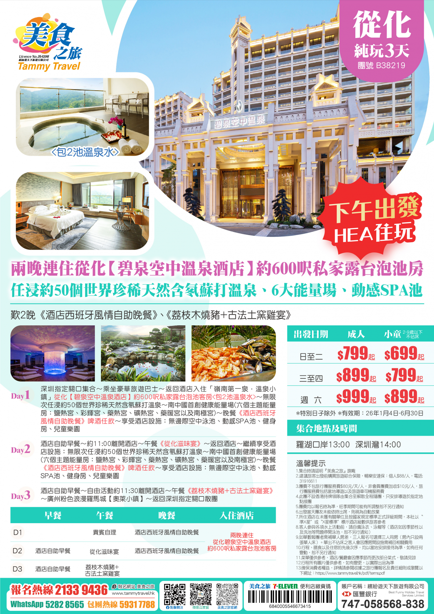 「下午出發·HEA住玩」兩晚連住從化【碧泉空中溫泉酒店】約600呎私家露台泡池客房、任浸約50個世界珍稀天然含氡蘇打溫泉、6大能量場、動感SPA池、歎2晚《酒店西班牙風情自助晚餐》純玩3天