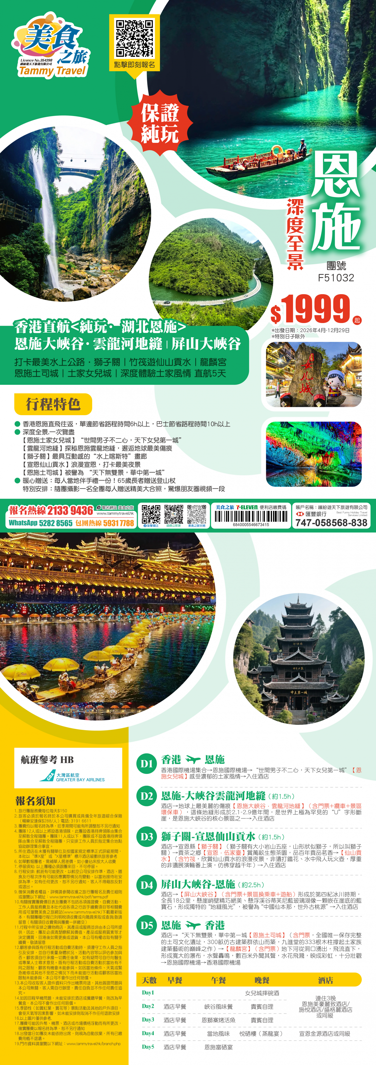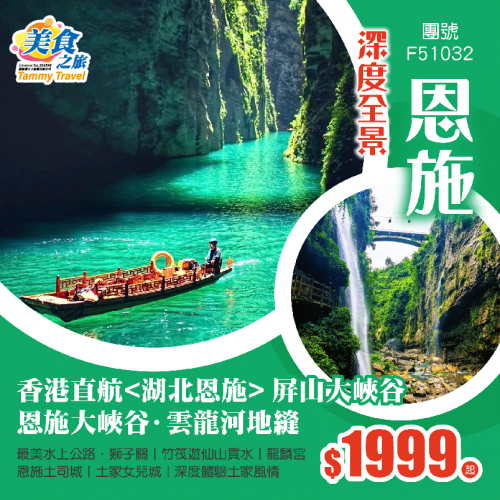 香港直航<純玩·湖北恩施> 深度全景 恩施大峽谷·雲龍河地縫 “中國仙本那”屏山大峽谷 打卡最美水上公路獅子關 仙山貢水 恩施土司城 龍麟宮 深度體驗土家風情 純玩直航5天