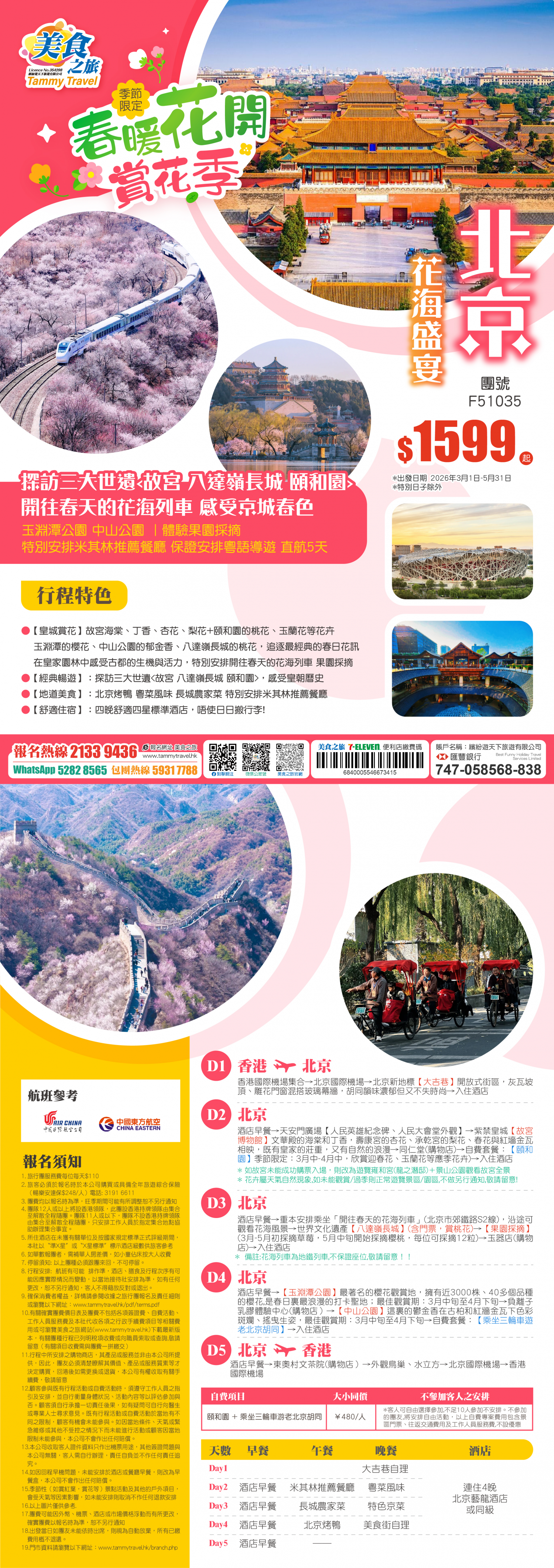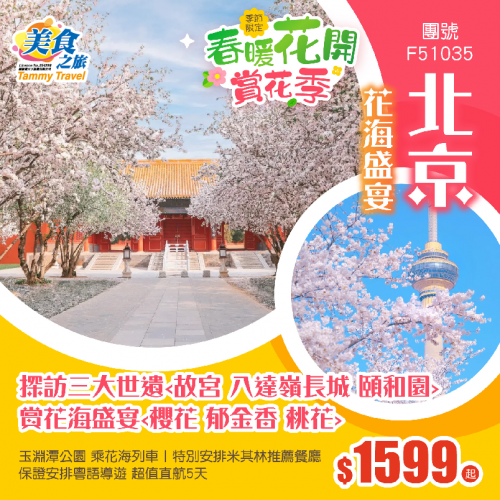【賞花季·北京】3大世遺<故宮 頤和園 居庸關長城>北海公園丨什刹海丨奧林匹克森林公園丨乘花海列車 飽覽京城浪漫春色連住4晚國際品牌酒店 保證安排粵語導遊 直航5天