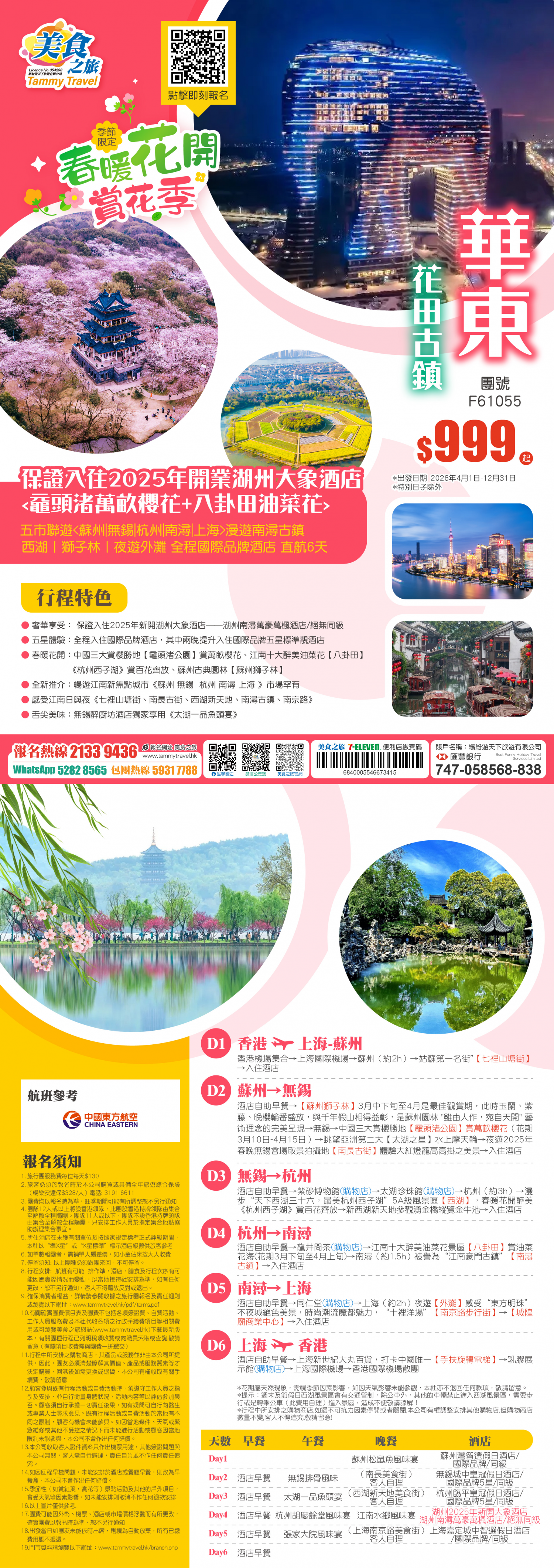 香港直航【賞花季·華東】 保證入住2025年開業湖州大象酒店 <黿頭渚萬畝櫻花+八卦田油菜花> 五市聯遊<蘇州|無錫|杭州|南潯|上海>漫遊南潯古鎮 西湖丨獅子林丨夜遊外灘 全程國際品牌酒店 直航6天