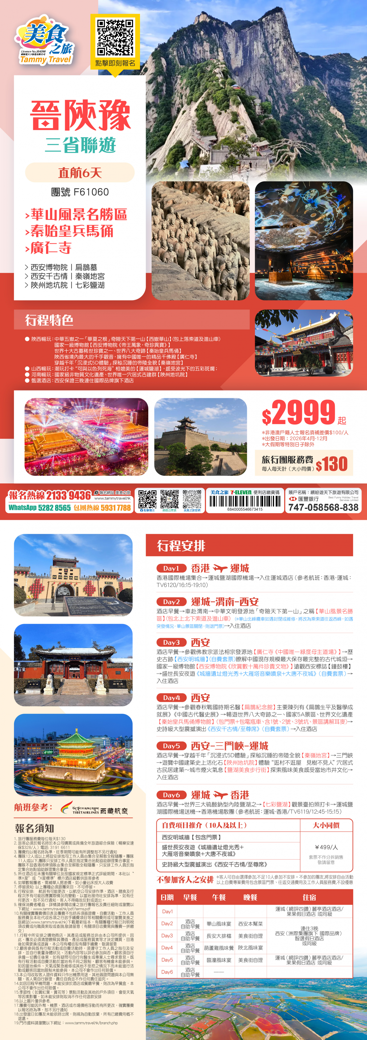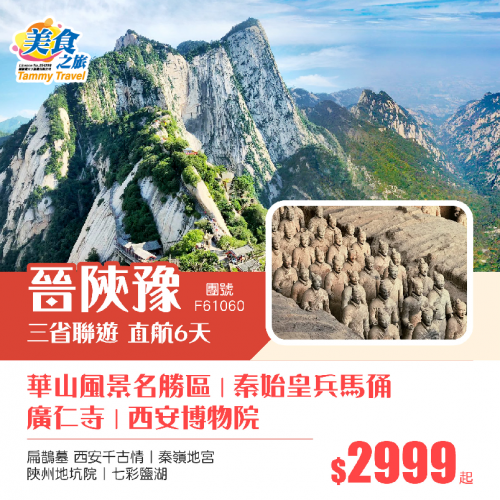 香港直航、純玩【晉、陝、豫三省聯遊】華山風景名勝區(包上落索道及進山車)、西安博物院、秦始皇兵馬俑、西安千古情、秦嶺地宮、陝州地坑院、七彩鹽湖純玩六日遊