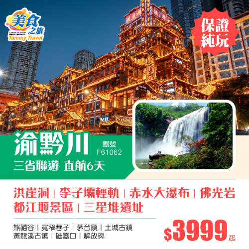《深圳機場往返》重慶、貴州、四川3省聯遊、赤水大瀑布、佛光岩、熊貓谷、洪崖洞、都江堰景區、李子壩輕軌穿樓、寬窄巷子、茅台鎮雙飛6天純玩團