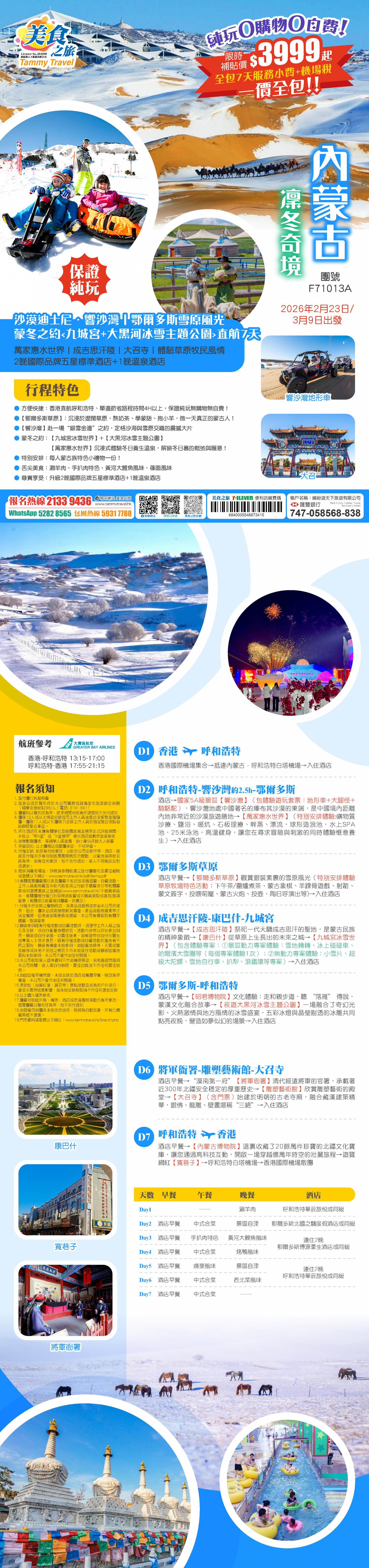 ● 方便快捷:香港直航呼和浩特、單邊節省路程時間4H以上,保證純玩無購物無自費!