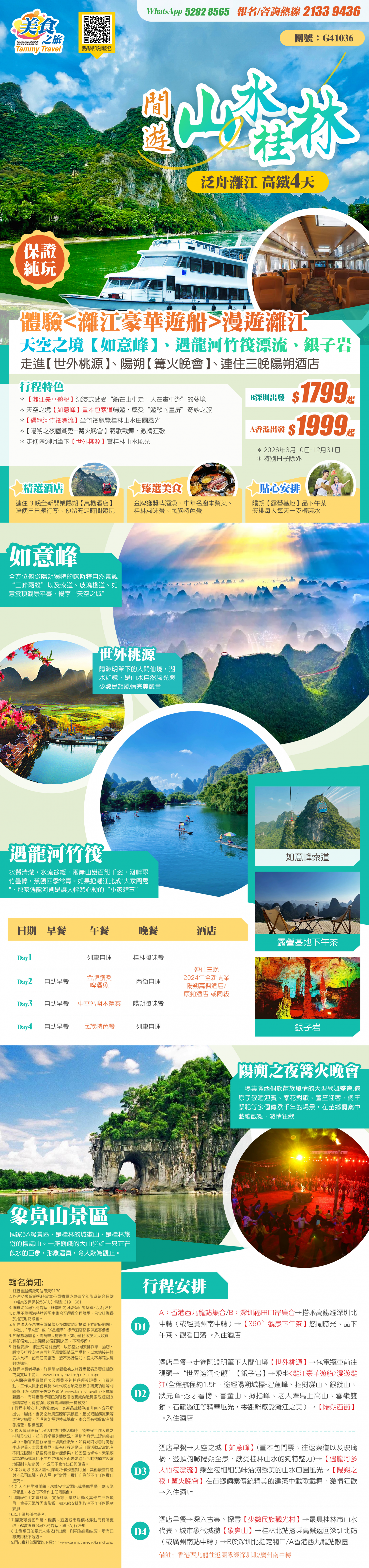 【純玩·桂林】體驗<豪華遊船>漫遊灕江、重本包索道暢遊【如意峰】、世外桃源、遇龍河竹筏、象鼻山、篝火晚會、連住三晚陽朔酒店、高鐵4天