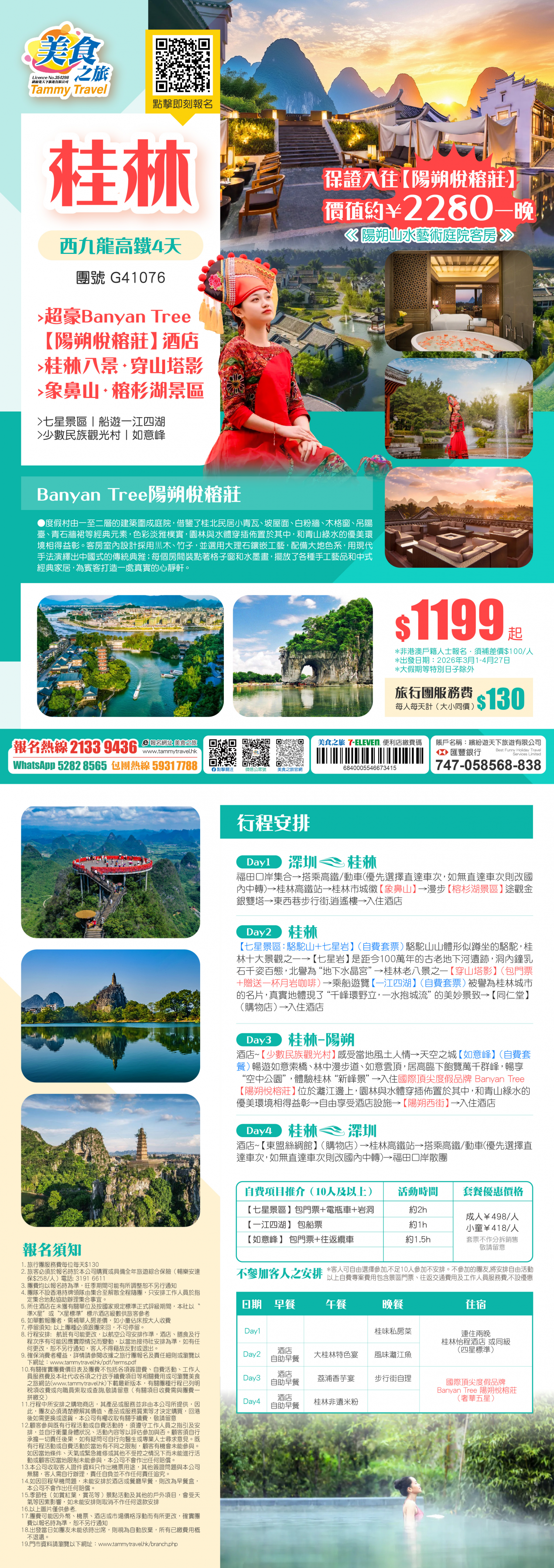 福田口岸集合→搭乘高鐵/動車(優先選擇直達車次,如無直達車次則改國內中轉)→桂林高鐵站→桂林市城徽【象鼻山】→漫步【榕杉湖景區】途觀金銀雙塔→東西巷步行街.逍遙樓→入住酒店
