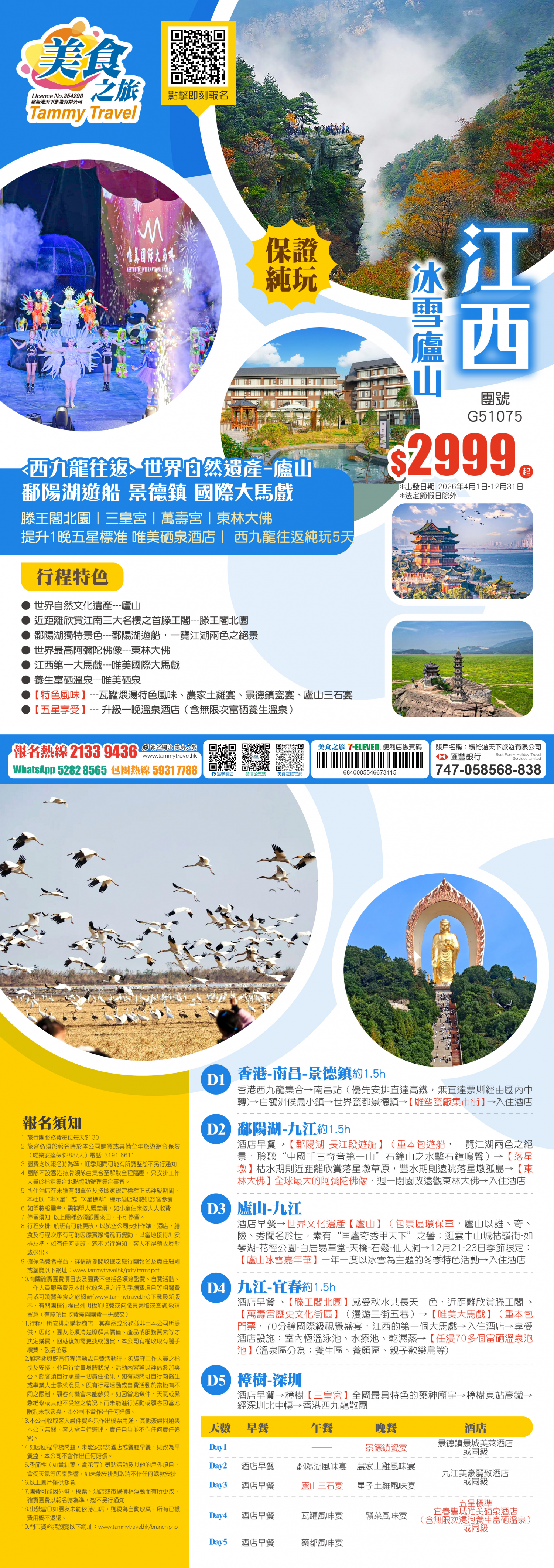 【10人成團·西九龍往返】別樣江西【廬山】鄱陽湖+長江段遊船丨景德鎮丨國際大馬戲丨滕王閣北園丨三皇宮丨萬壽宮丨東林大佛 提升1晚五星標准 唯美硒泉酒店 純玩5天高鐵團