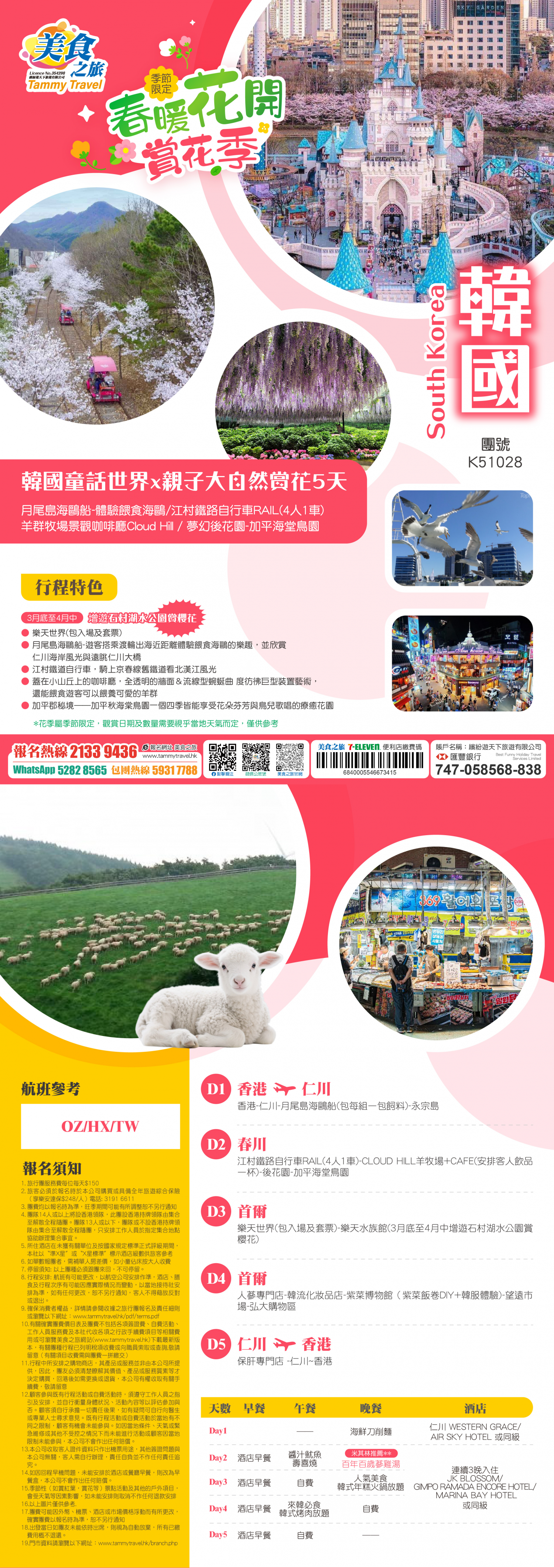 韓國童話世界x親子大自然賞花5天團 樂天世界/月尾島海鷗船-體驗餵食海鷗/江村鐵路自行車RAIL(4人1車)/ 羊群牧場景觀咖啡廳Cloud Hill / 夢幻後花園-加平海堂鳥園